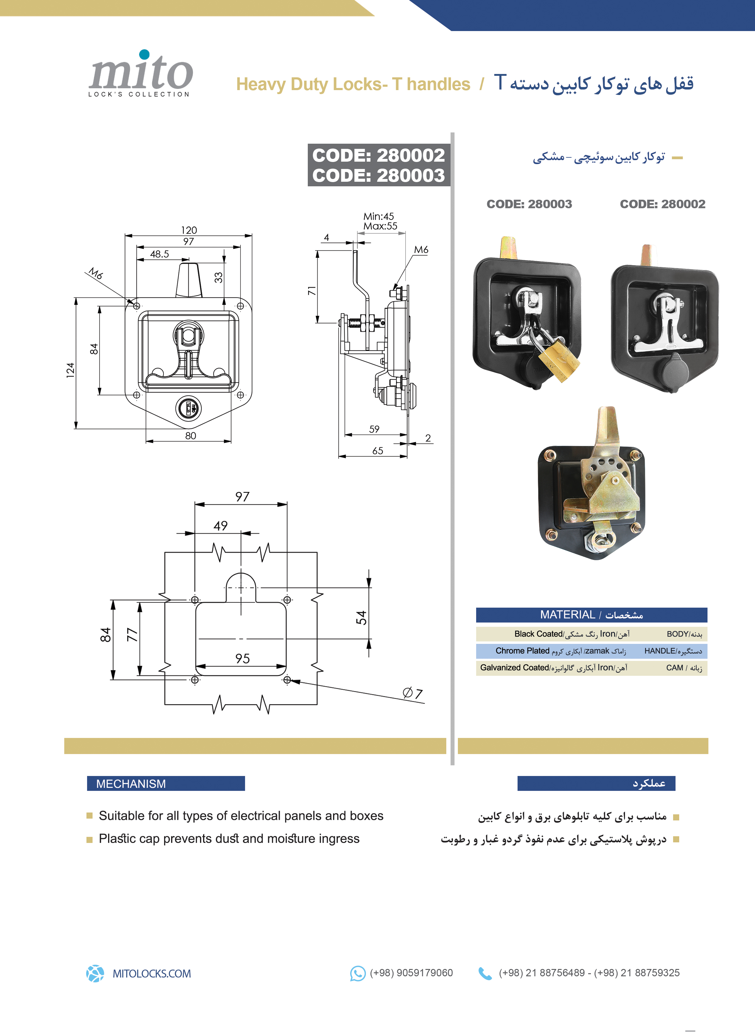 این قفل توکار کابین آهنی با طراحی مقاوم و با دسته T، بهویژه برای استفاده در باکسهای آفرود و تجهیزات جانبی خودروهای آفرود طراحی شده است. جنس بدنه قفل از آهن مقاوم است که با روکش رنگ مشکی پوشیده شده تا در برابر شرایط سخت محیطی مانند رطوبت، گردوغبار و ضربه مقاومت بالایی داشته باشد.